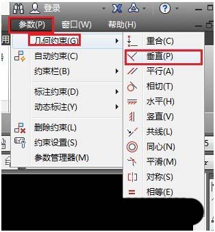 1、菜單欄:鼠標左鍵點擊選擇【參數】-【幾何約束】-【垂直】,鼠標左鍵點擊【垂直】。