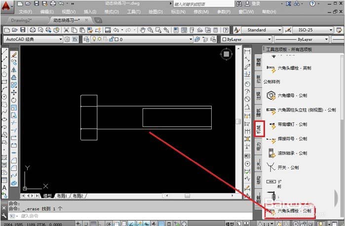 2、打開“工具選項板”后,點擊“機械”,再點擊“六角頭螺栓”,并將其拖到視圖的空白位置,視圖中將顯示“六角頭螺栓”圖塊對象。