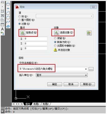 4、在命令行中輸入“寫塊”命令(W),將彈出“寫塊”對話框,將分解的圖形對象保存為“動態六角頭螺栓”圖塊對象,點擊選擇對象,選擇剛才圖形中六角頭螺栓