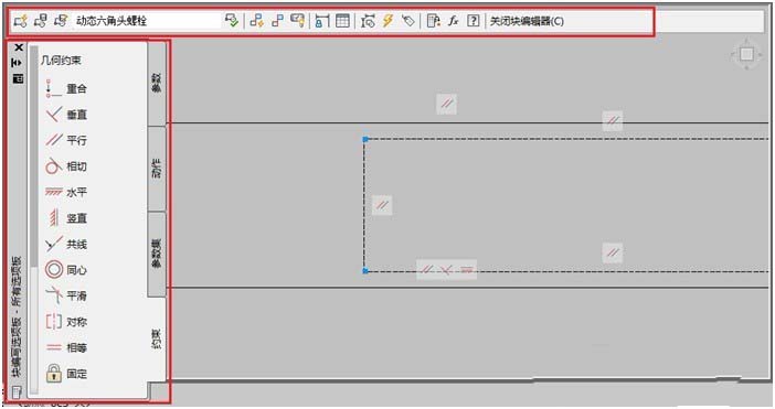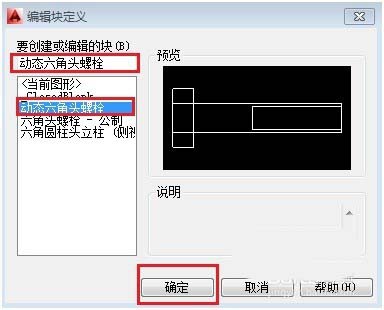 6、在視圖中雙擊動態六角頭螺栓圖塊對象,彈出“編輯塊定義”對話框,在列表中選擇“動態六角頭螺栓”對象,再單擊“確定”按鈕,系統將打開“塊編寫選項板”面板和“塊編輯器”工具欄。