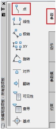 7、在“塊編寫選項板”中,切換到“參數”選項卡,選擇“點”參數,再選擇圖塊上的任意一點,便出現“位置”參數的圖示。