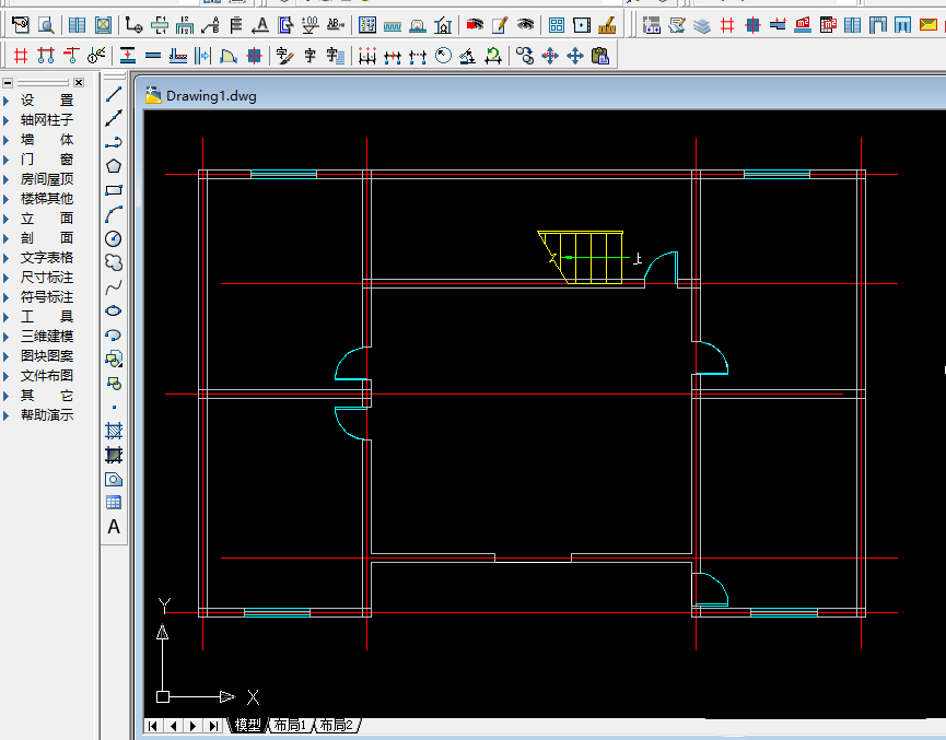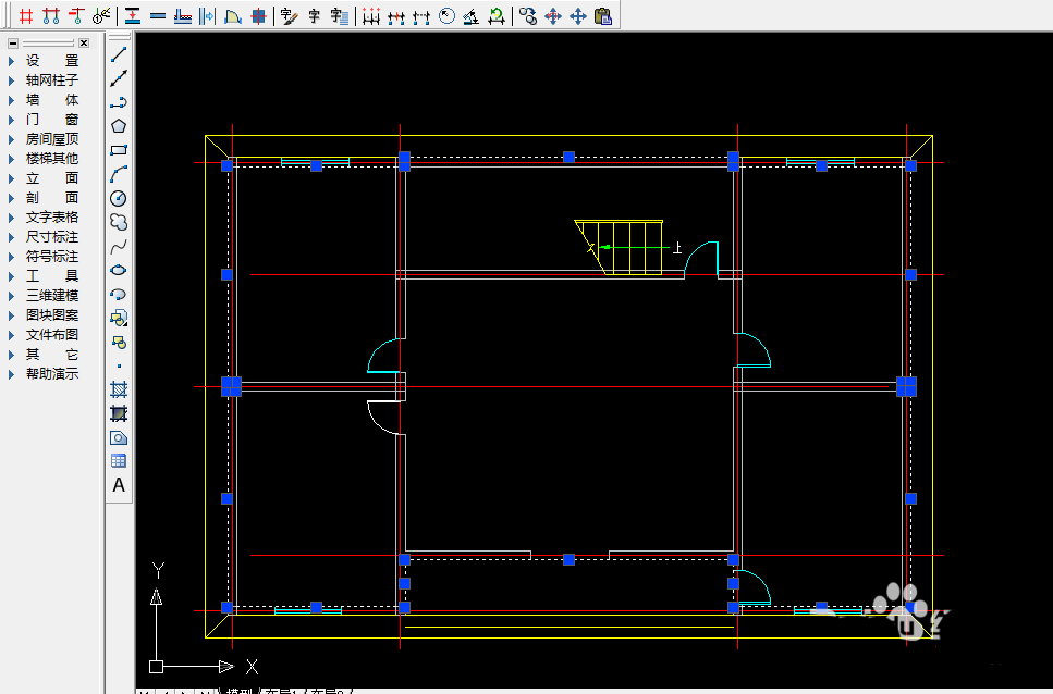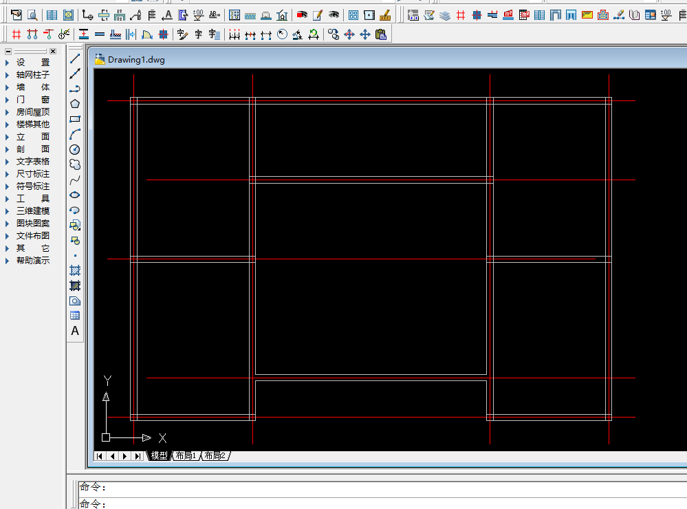 2、在軸網上繪制墻體,墻體繪制完成后,如下圖所示