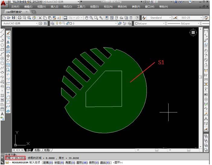 8、從下圖可以看出綠色區(qū)域的面積S1=29.1211mm2。