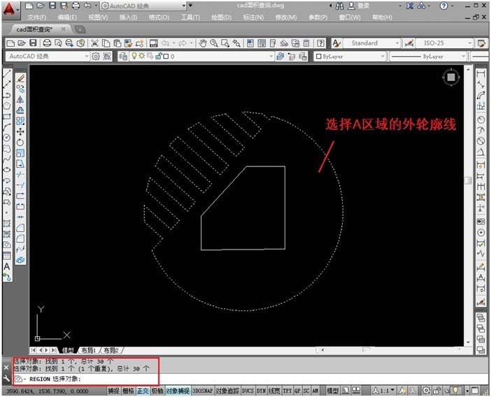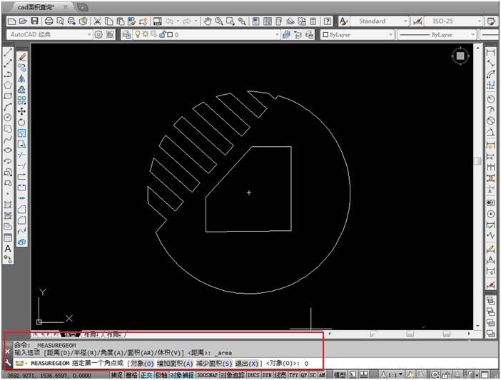 7、打開面積測量命令,輸入“O”,按Enter,回車,選擇剛才創(chuàng)建的面域?qū)ο驛。