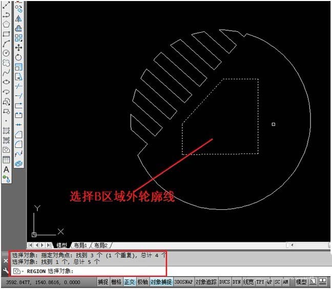 5、繼續(xù)創(chuàng)建面域B,選擇B區(qū)域外的輪廓線,如圖所示,按鼠標(biāo)右鍵或Enter確定。