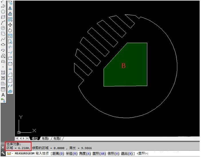 9、下面我們接著求B區(qū)域的面積,按Enter鍵回車,繼續(xù)面域測量命令,輸入“o” 按Enter,回車,選擇剛才創(chuàng)建的面域?qū)ο驜。