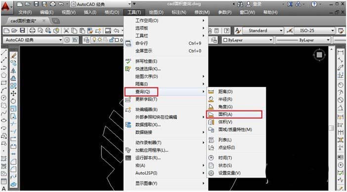 6、打開“工具”下拉菜單“查詢”,點(diǎn)擊“面積。