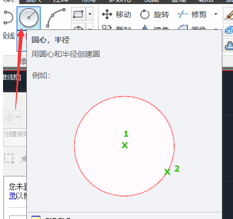 點(diǎn)擊命令之后這里注意下的命令中示只需要按照示進(jìn)行操作即可。首先選擇個(gè)圓心位置選擇好之后鼠標(biāo)左鍵擊一次然輸圓的半徑然后再次點(diǎn)擊鼠標(biāo)左鍵或者點(diǎn)擊鍵空都可以。