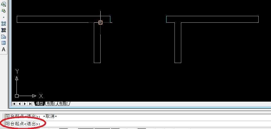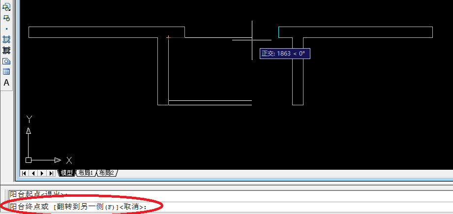 5、輸入完成后,根據命令行提示依次點擊“陽臺起點”、“陽臺終點”,如下圖所示