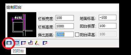3、打開“繪制陽臺”編輯頁面,點擊“凹陽臺”,如下圖所示