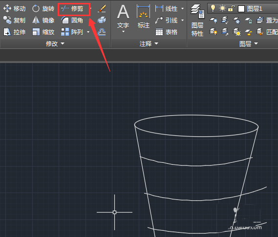 7、繪制好圓弧線之后,再在修改菜單那里找到修剪選項,如圖所示: