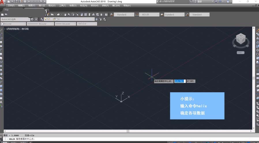 3、然后輸入命令“helix”,確定中心點(diǎn)、半徑、底面半徑、高度