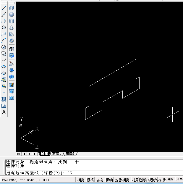 3、使用拉伸命令,將面域沿Z軸方向拉伸為實體