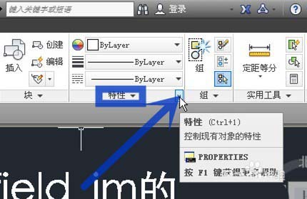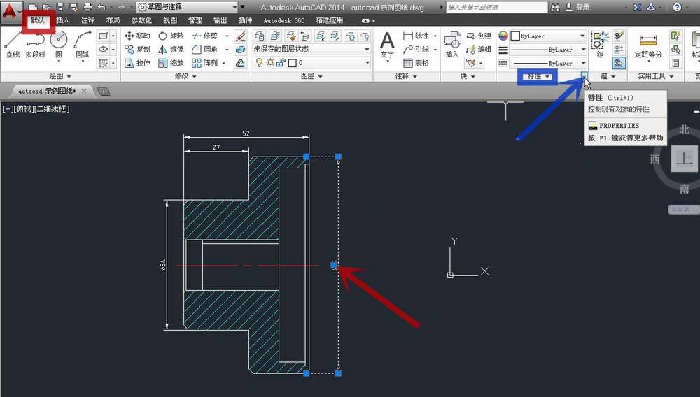 2、單擊選中尺寸“90”(圖中紅色箭頭所指)后,點(diǎn)擊“默認(rèn)”選項(xiàng)卡(圖中紅框)下的“特性”選項(xiàng)組(圖中藍(lán)框)的下拉箭頭(圖中藍(lán)色箭頭所指)