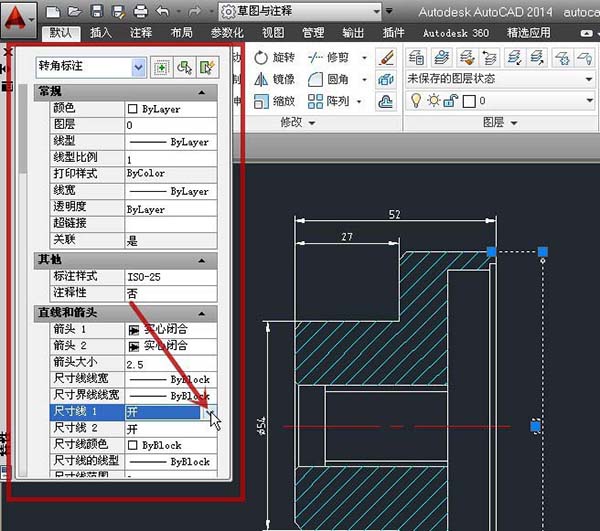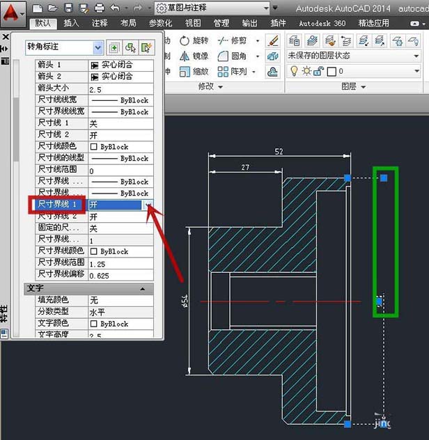5、可見(jiàn)尺寸“90”的上半段尺寸線不見(jiàn)了(圖中綠框),在特性欄往下拉,找到“尺寸界線 1”(圖中紅框),點(diǎn)擊其下拉箭頭(圖中紅色箭頭所指)