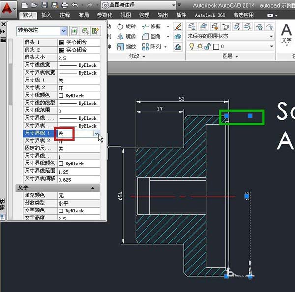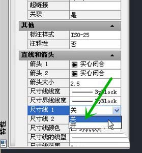 6、在彈出的菜單中選擇“關(guān)”(圖中紅框),可見(jiàn)尺寸“90”的上半段的尺寸界線也不見(jiàn)了(圖中綠框)