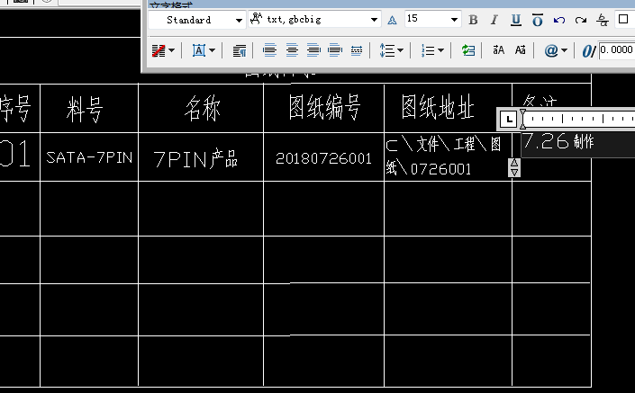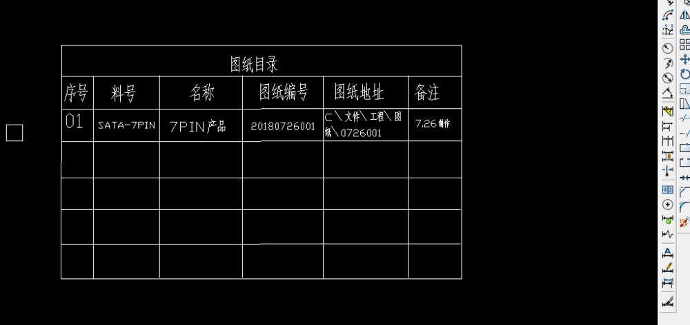 7、表格畫好了之后,依次為每一列加上名稱。使用文字工具,由左至右,列名稱分別為序號(hào)、料號(hào)、名稱、圖紙編號(hào)、圖紙位置、備注,如下圖所示