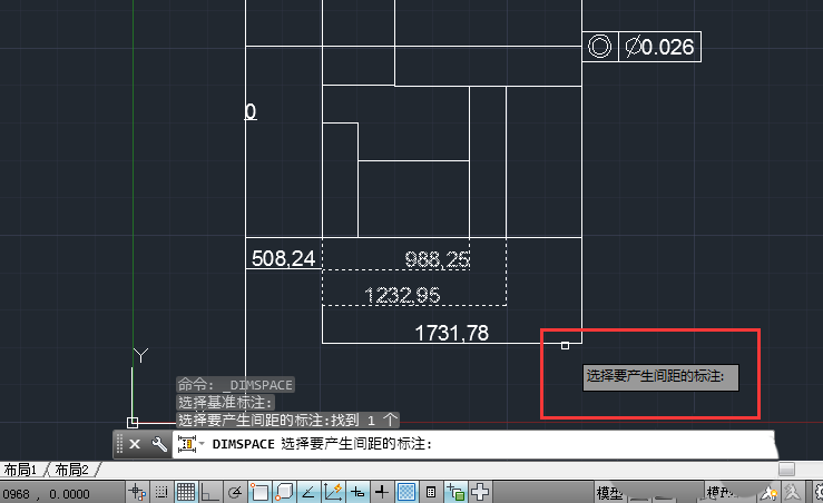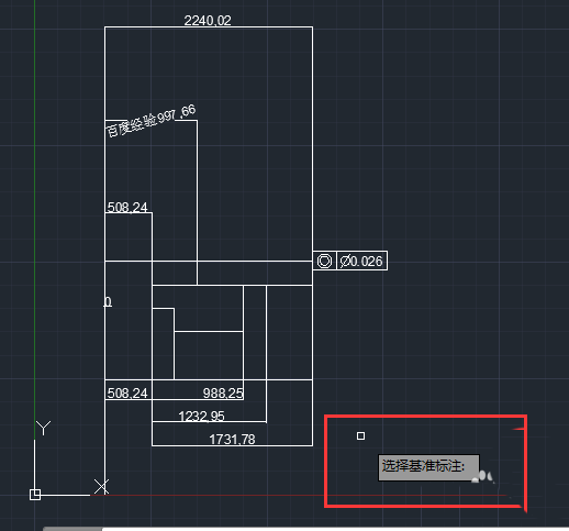 3、基準標注選中后呈虛線狀,接著提示選擇要產生間距的標注。