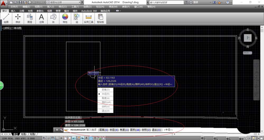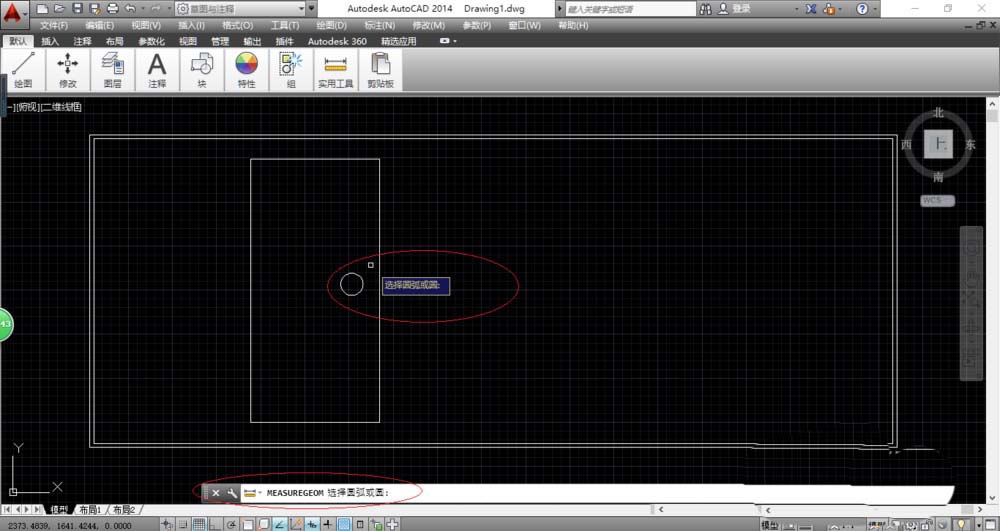 5、命令窗口顯示"MEASUREGEOM 選擇圓弧或圓",如圖所示。拾取測量半徑長度的圓,按回車鍵確認。