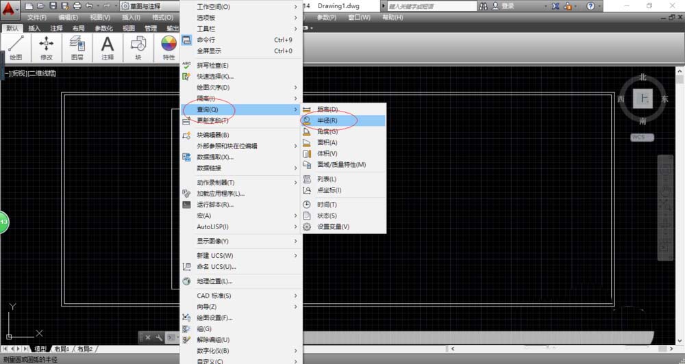 4、如圖所示,彈出"工具"菜單選項。點擊"查詢"子菜單向右箭頭,彈出級聯菜單選擇"半徑"項。