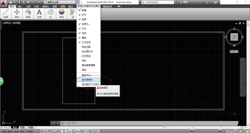2、如圖所示,點擊自定義快速訪問工具欄向下箭頭。彈出下拉列表選項,選擇"顯示菜單欄"項。