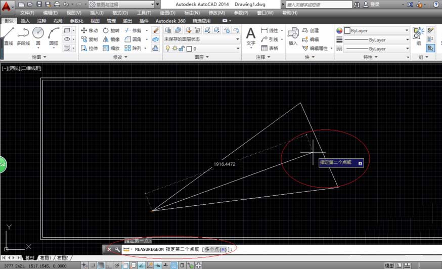 5、命令窗口顯示"MEASUREGEOM 指定第二個點或[多個點(M)]",如圖所示。拾取測量兩點長度的第二點,單擊鼠標左鍵確認。