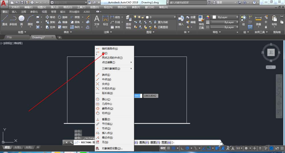 4、選擇矩形,然后在繪圖局域按下shift+鼠標右鍵選擇自命令,捕捉端點如圖: