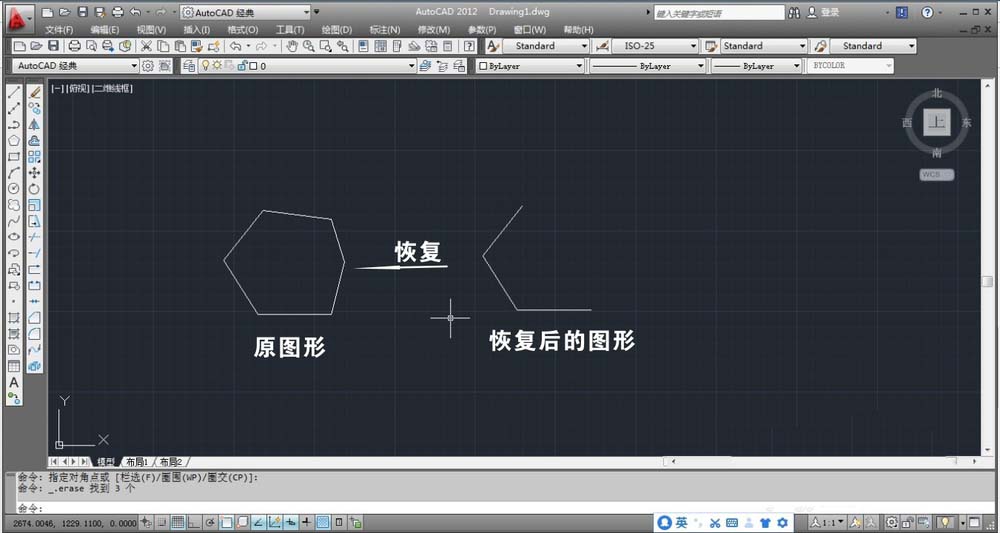 6、假如我們把繪圖區的六邊形(或其它的圖形和命令)進行了多次刪除、移動、修改角度等等,我們都可以把它進行恢復到想要的位置。