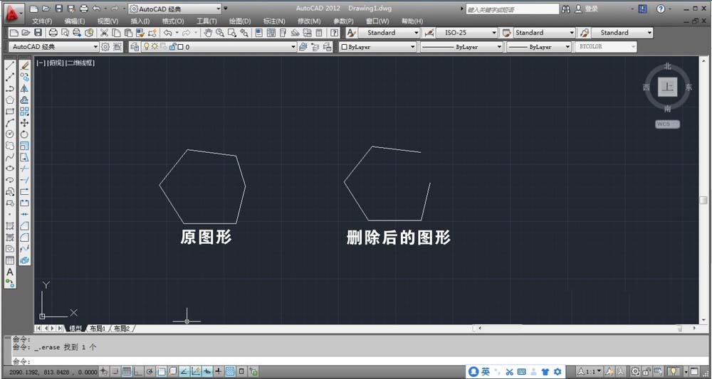 3、此時我們可以刪除此此六邊形的某一個邊,在命令提示窗口輸入E,點擊空格鍵,用鼠標左鍵點選需要刪除的圖形。