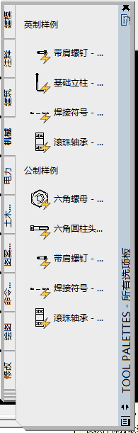 4、在工具選項板左側有一豎排主功能,我們可以在這里選擇機械,打開機械以后就可以看到滾珠軸承了,如圖