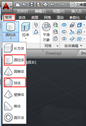 2、然后點擊菜單欄【常用】》【建模】》【球體】和【圓柱體】選項。