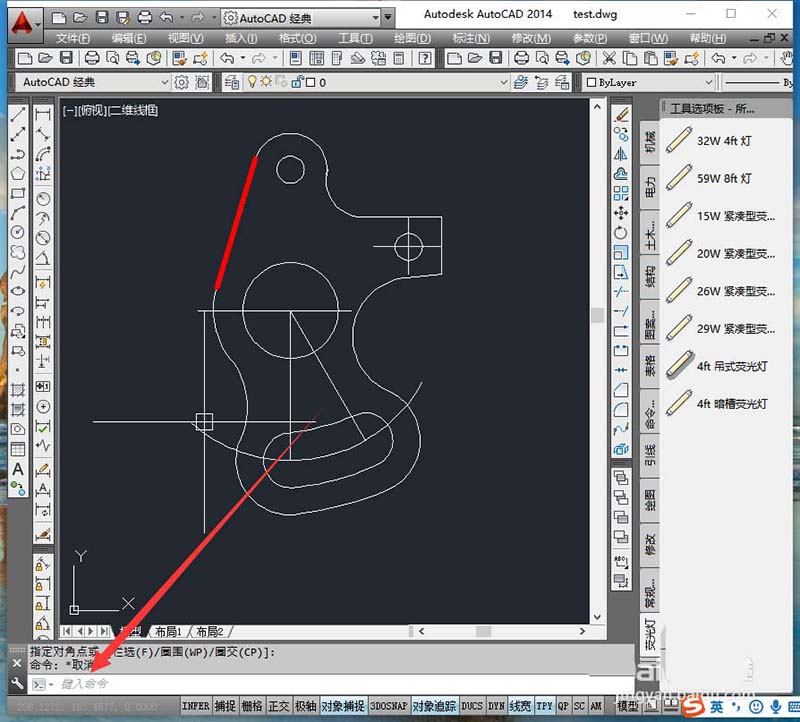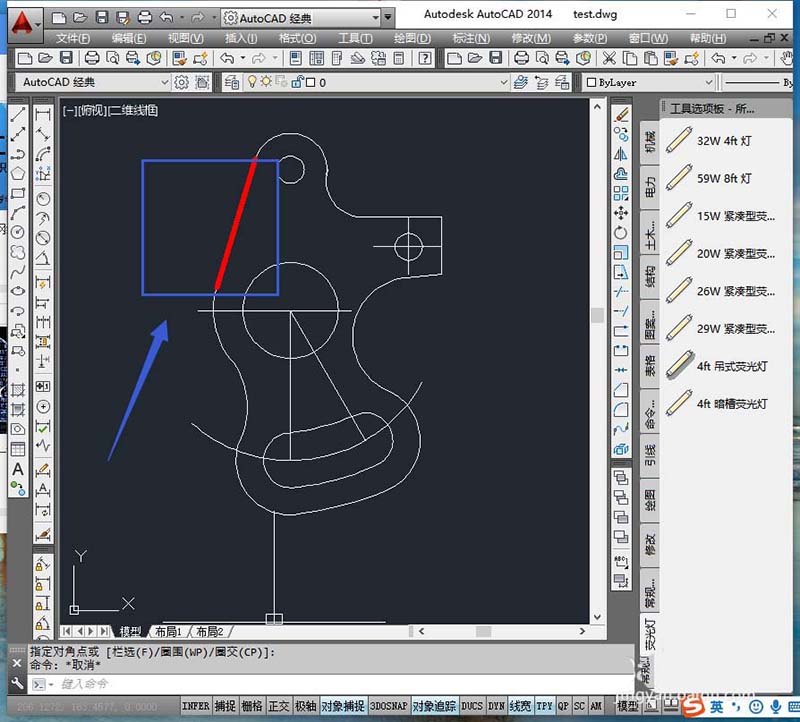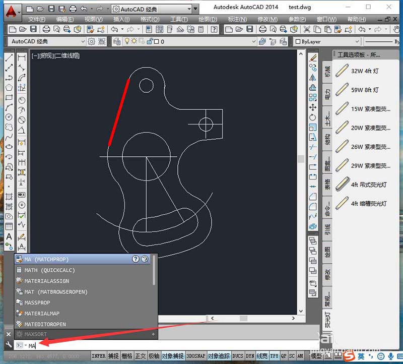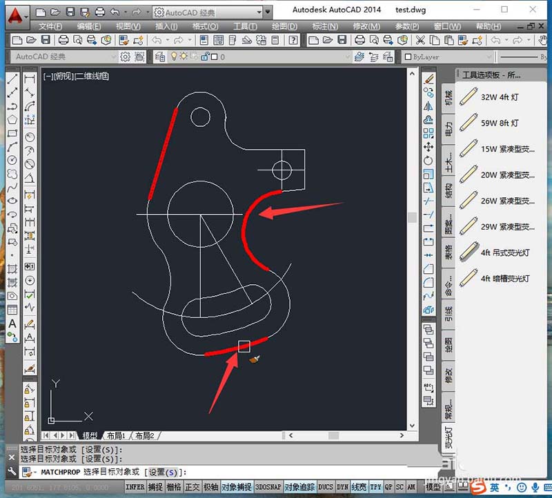 1、打開圖紙,我們要將圖形中的 紅色直線和這條直線的線寬復制到別的圖形上。
