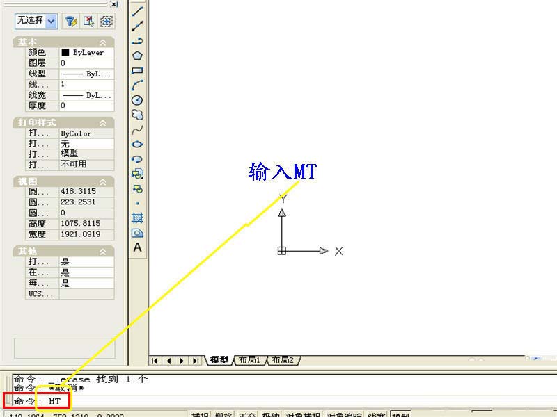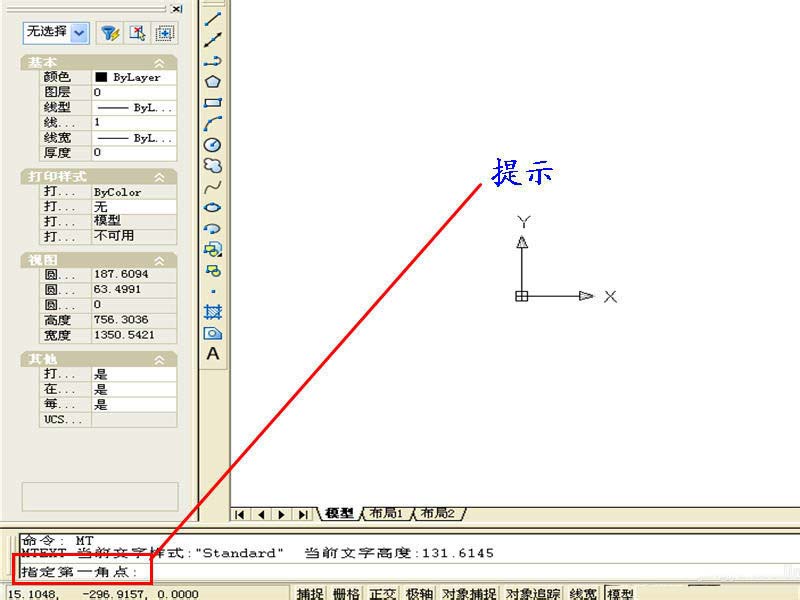 6、通過命令符,設置文字輸入。在CAD主界面的下方,有一個命令符的輸入窗口,在這個窗口中,輸入MT,回車。當出現“指定第一角點”的提示時,即可重復第三步和第四步,完成文字的輸入和編輯。