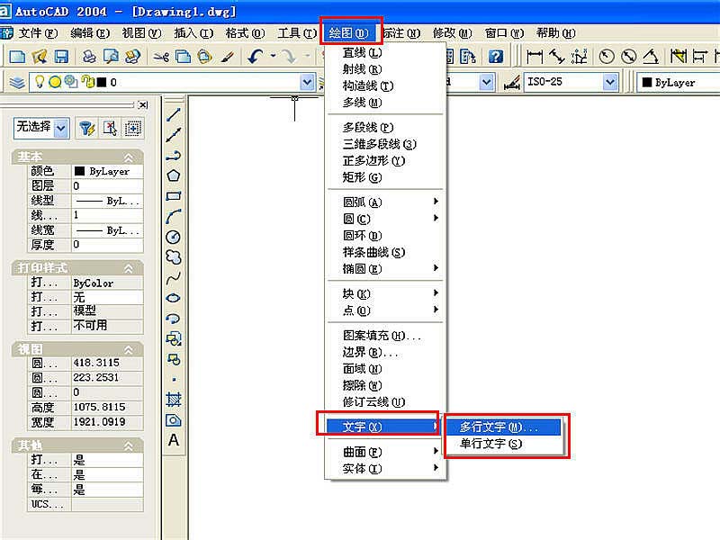 5、文字輸入還有另一種方法:在cad的主界面,單擊”繪圖——文字——多行文字或者單行文字”,設置完成之后,輸入文字的方法和上述第3步和第4步的方法基本相同。需要注意的是,單行文字和多行文字是有區(qū)別的,在實際操作中可以很明白的弄懂這些區(qū)別,不一一贅述。