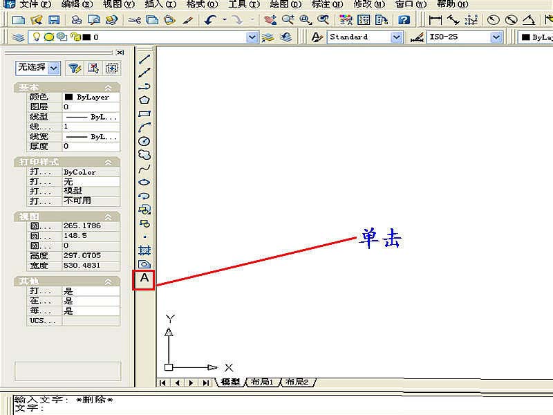 2、打開輸入對話框。打開cad軟件之后,進入到cad軟件的主界面,在主界面上的左側最下方,可以看到一個不太顯眼的字母”A“。這個字母就是輸入文字的命令鍵,單擊這個鍵,即可進入到文字輸入的界面。