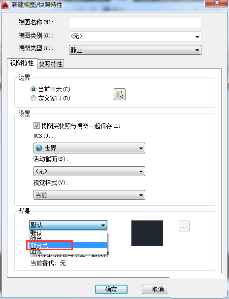 3、在【新建視圖/快照特性】對話框中,輸入視圖名稱,然后單擊【背景】下拉按鈕,選擇背景顏色,這里選擇【漸變色】選項。
