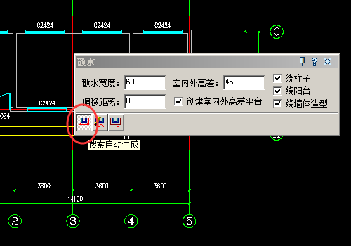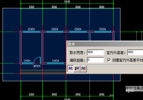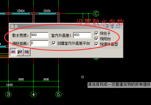 4、選擇好以后我們設置散水的各項參數,首先設置散水的寬度900,室外高差設置為450。其他按照默認即可。