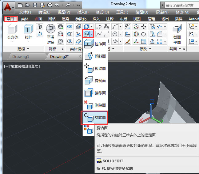 5、而菜單欄的【常用】》【實(shí)體編輯】》【旋轉(zhuǎn)面】可以旋轉(zhuǎn)編輯后的面。