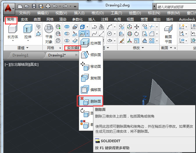 3、菜單欄的【常用】》【實(shí)體編輯】》【刪除面】可以刪除的面包括【圓角】、【倒角】及挖孔的(差集)內(nèi)部面。