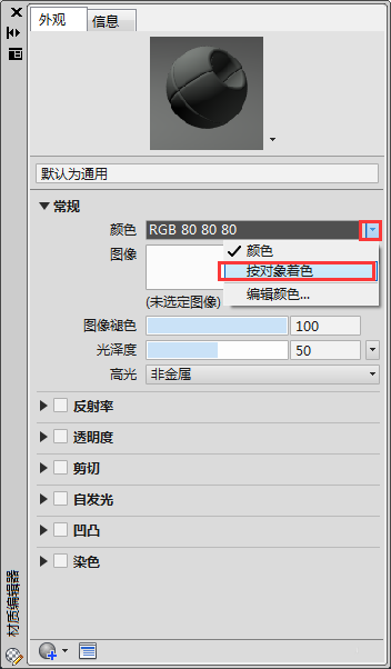 2、在名稱文本框中輸入材質新名稱,單擊【顏色】下拉按鈕,選擇【按對象著色】選項,如圖。