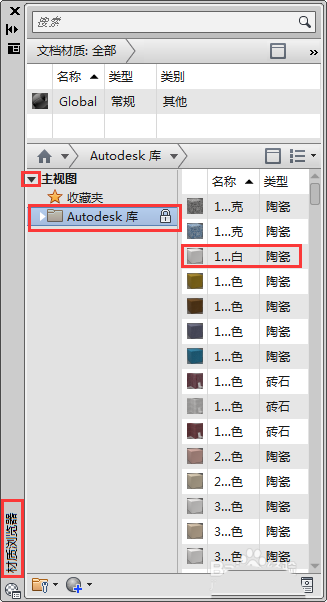 2、打開【材質瀏覽器】選項板,單擊【主視圖】折疊按鈕,選擇【Autodesk庫】選項,在右側材質縮略圖里,單擊所需材質的編輯按鈕。