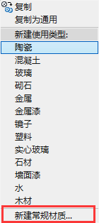 1、在菜單欄依次選擇【渲染】》【材質】選項,點擊右下角的小箭頭打開【材質編輯器】選項板,單擊【創建或復制材質】按鈕,選擇【新建常規材質】選項。