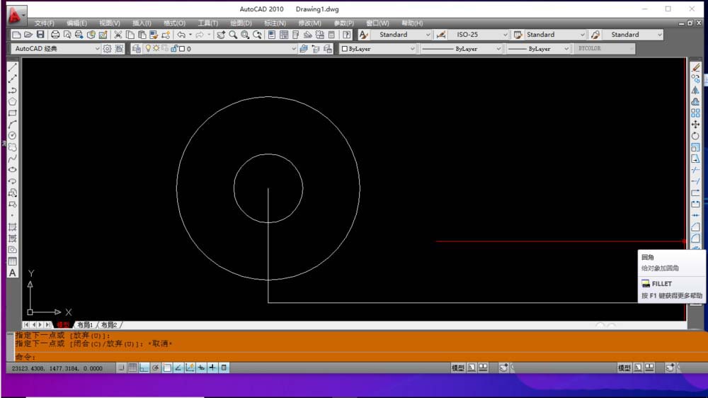 3、關(guān)鍵就在于這兩段如何連接。通過(guò)數(shù)學(xué)方法確實(shí)可以,一個(gè)個(gè)輔助圓去畫(huà),求圓心,再刪除。但是太慢了。這里我們選擇右邊的圓角工具,或者命令“f”