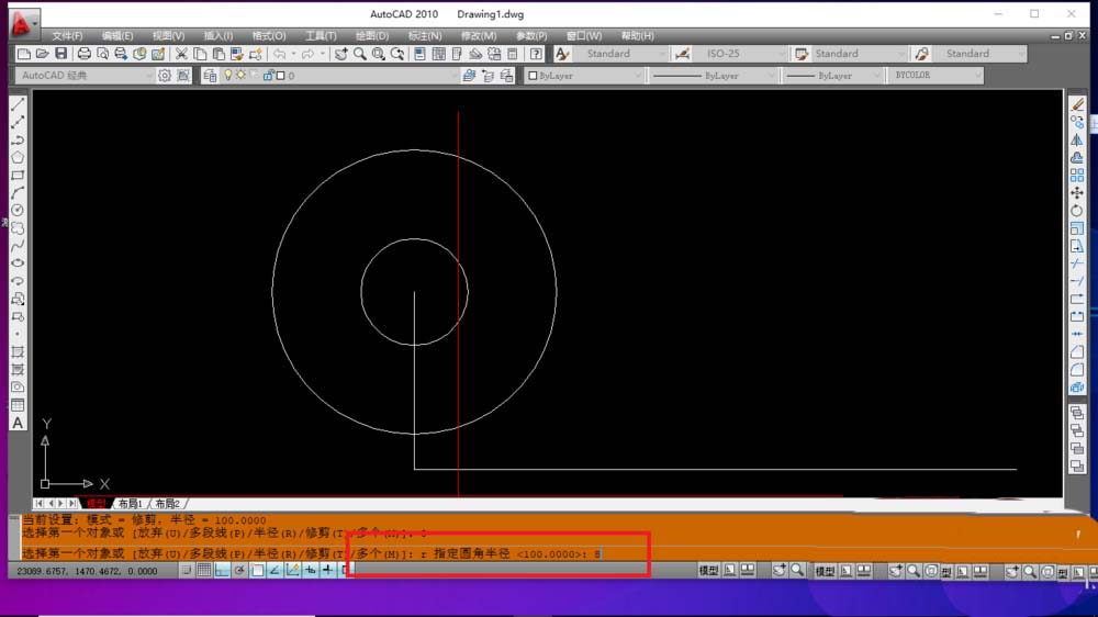 4、選擇圓角工具后,看到下方的選擇,輸入“r”,然后空格確定,輸入圖紙中的半徑“8”