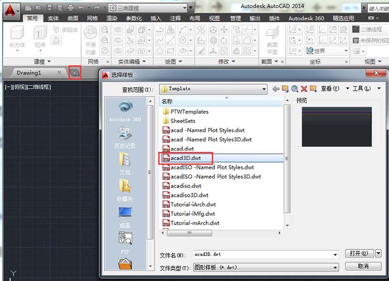 1、首先運行AutoCAD2014軟件,點擊加號,從【選擇樣板】中選擇acad3D.dwt。