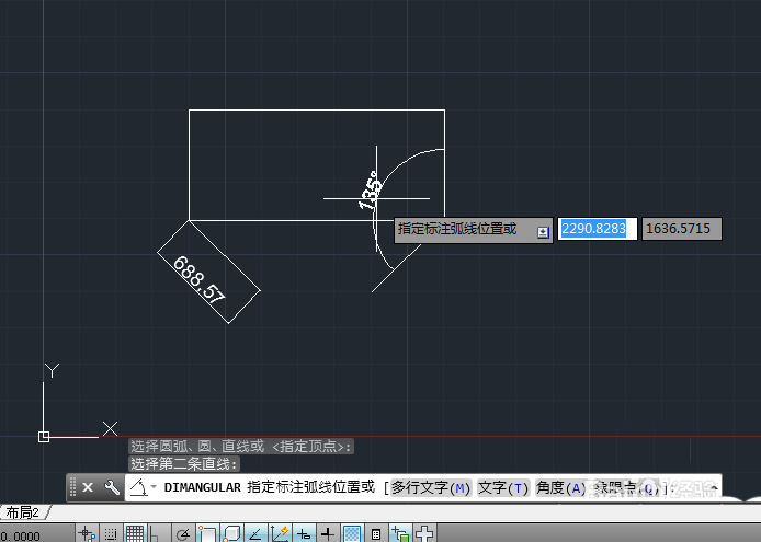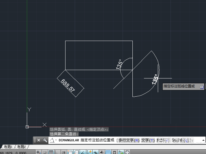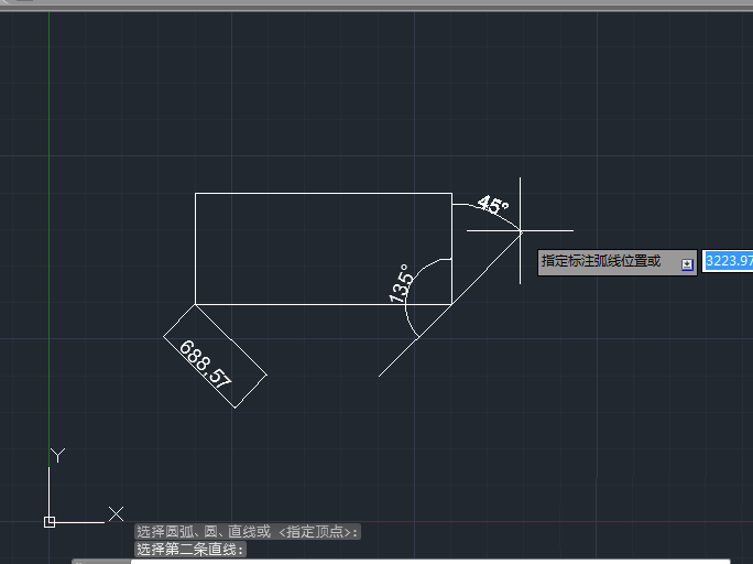 6、角度標注時,選擇尺寸標注的位置是關鍵,當尺寸標注放置在當前測量角度之外時所測量的角度則是當前角度的補交,如圖所示。