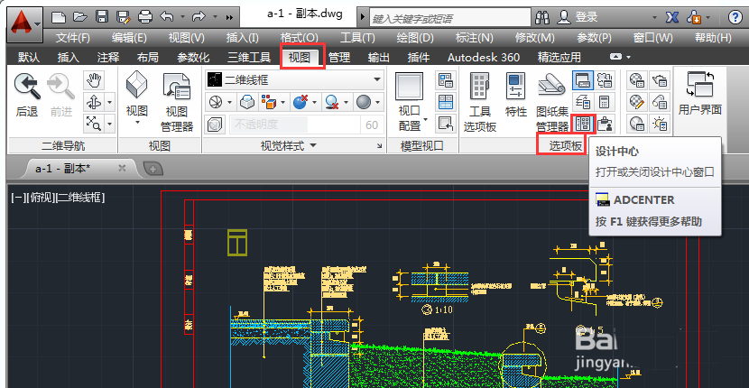 1、在菜單欄依次選擇【視圖】》【選項板】》【設計中心】選項。