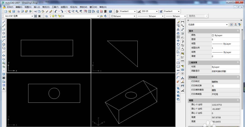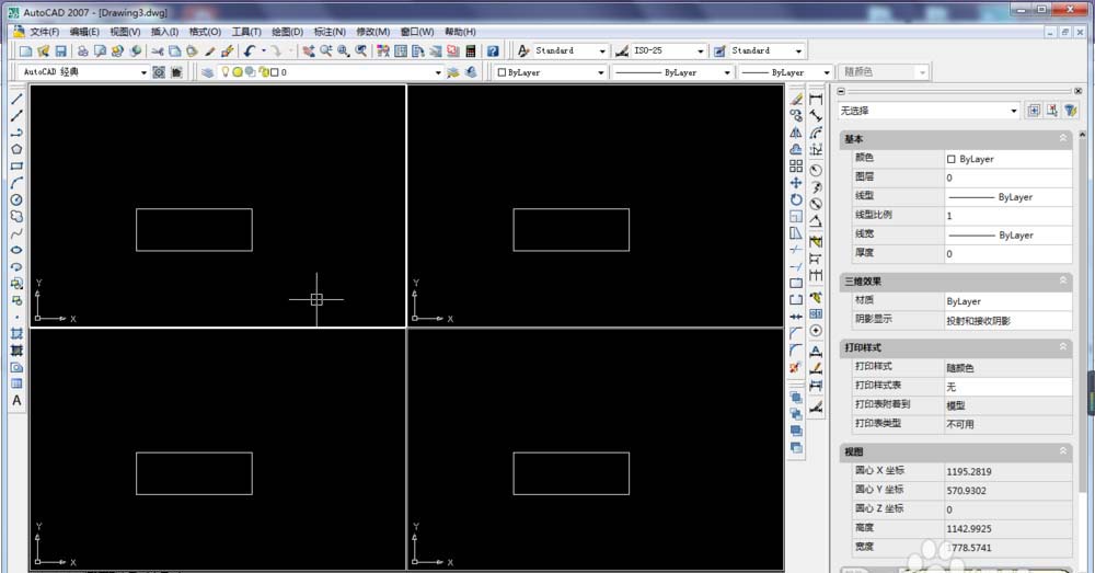 4、在第一個視口中畫一個長方形,可以看到四個視口同時出現長方形,這意味著四個視口同步,而形狀相同則意味著四個視口視圖方向一致。