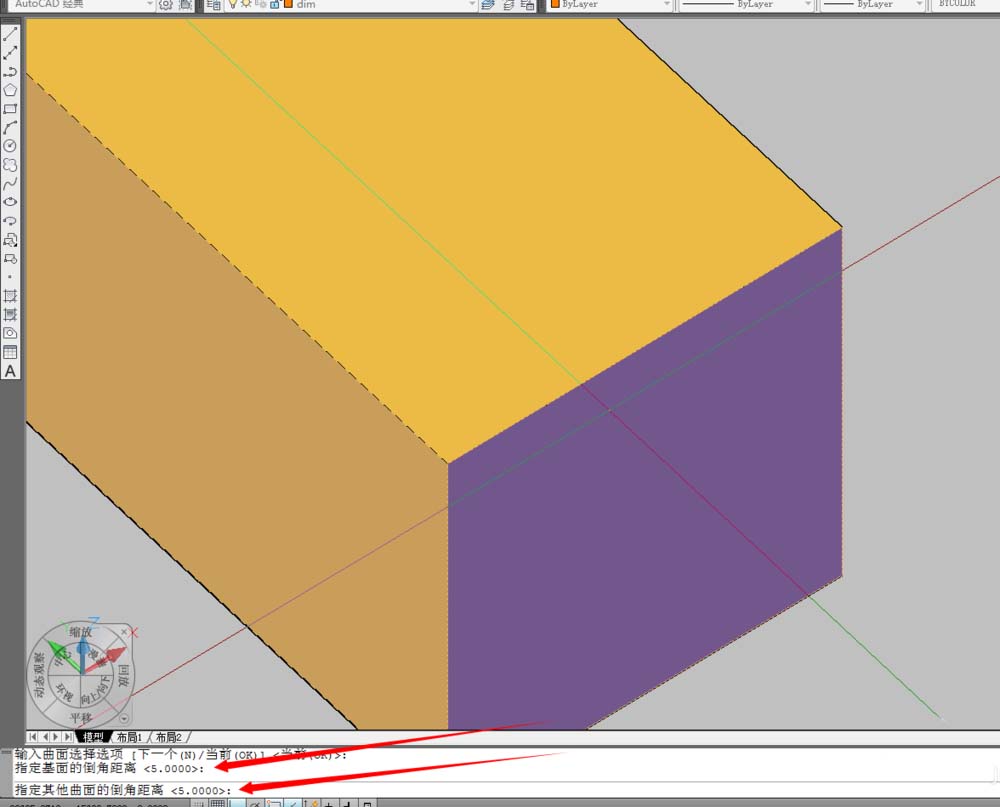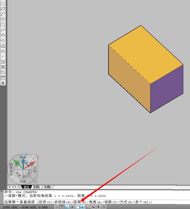 3、讓我們選擇D(距離)然后空格輸入倒角的距離,然后第二個邊的距離。