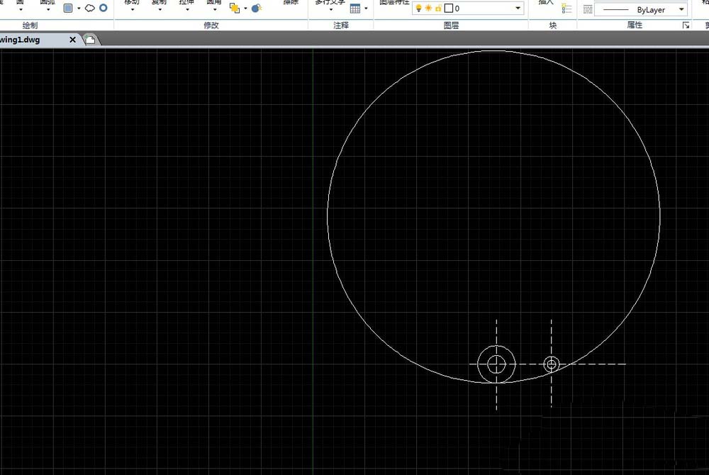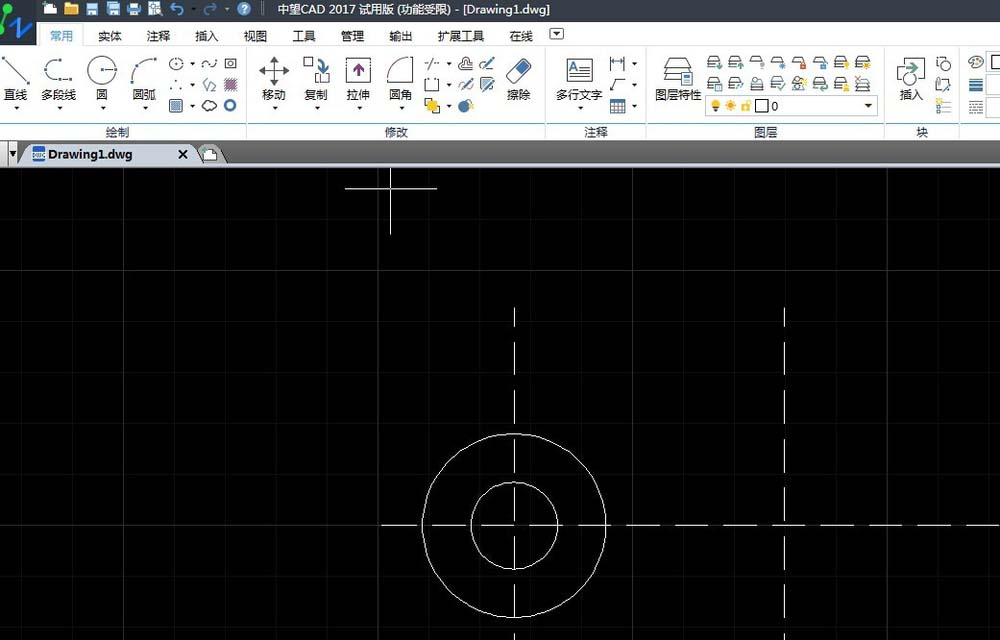 2、畫好虛線之后我們開始繪制我們需要的零件圖形,首先繪制兩個大圓,在這里我們分別選擇的是直徑為17和直徑為36的圓
